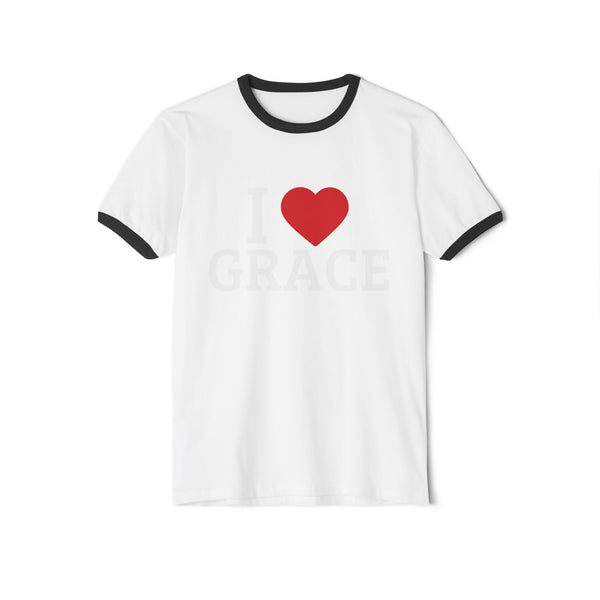 This soft, lightweight ringer tee brings a vintage-inspired message into everyday wear. The clean graphic — bold white type with a bright red heart — reads easy from across a room and sits centered on a heathered light background framed by contrasting black collar and sleeve rings. It drapes casually in a classic fit, feels breathable in warm weather, and the tear-away label keeps the back of the neck comfortable. Wear it layered under an open flannel, with denim for weekend errands, or as a quiet statement at a community gathering — it reads like a small, honest declaration that blends faith and style without shouting.
