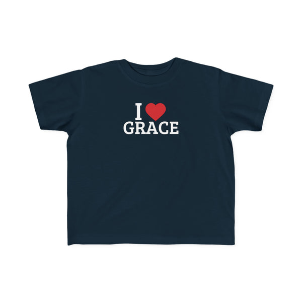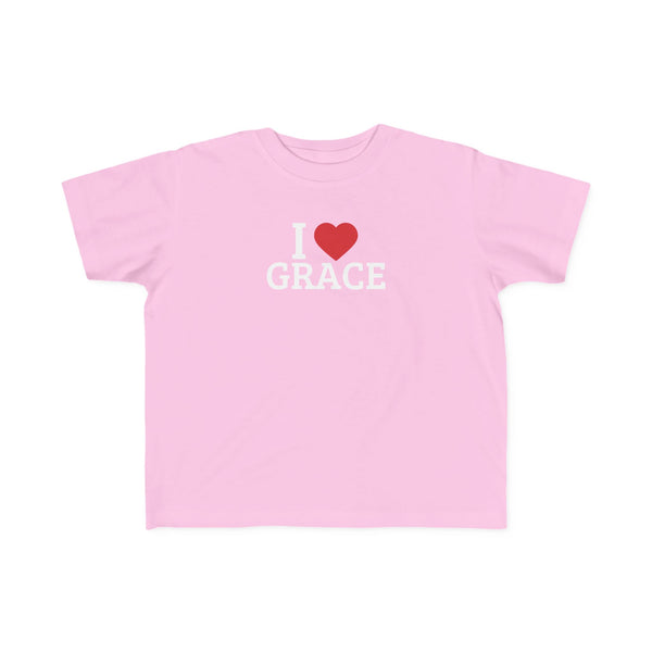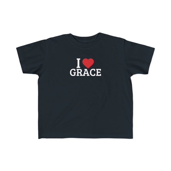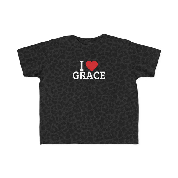 This toddler tee brings playful confidence to little wardrobes. Soft, light fabric and a classic fit let kids move freely while the bold “I ♥ GRACE” chest print makes a joyful statement. The subtle all-over leopard pattern on the fabric adds a touch of personality without overwhelming the design, making this shirt feel lived-in and familiar from day one. Built with reinforced shoulder tape and side seams, it keeps its shape through messy play and frequent washing. The tear-away label and gentle knit collar make dressing easier and more comfortable for sensitive skin. Sized to run true, it layers well under jackets or pairs with leggings and sneakers for everyday adventures.