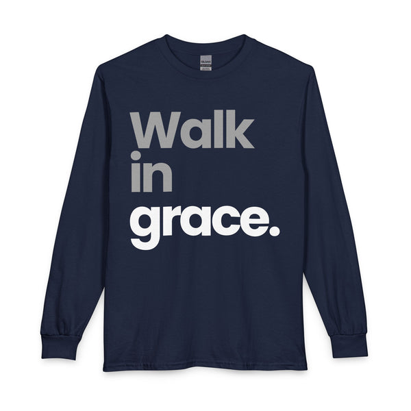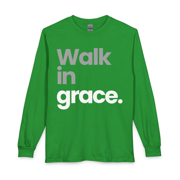 Soft, understated, and quietly bold — this long sleeve tee carries a gentle reminder in clean, modern type: Walk in grace. The fabric feels familiar against skin: sturdy spun cotton that breathes and settles into everyday rhythms. Wear it on slow Sundays, between errands, or layered under a jacket for evening gatherings. The message sits large and simple, a calm statement that opens conversations without shouting. For someone who values faith, mindfulness, or gentle encouragement, this shirt becomes part of their daily cadence — a comforting layer and a humble declaration that travels with them from coffee runs to community moments.